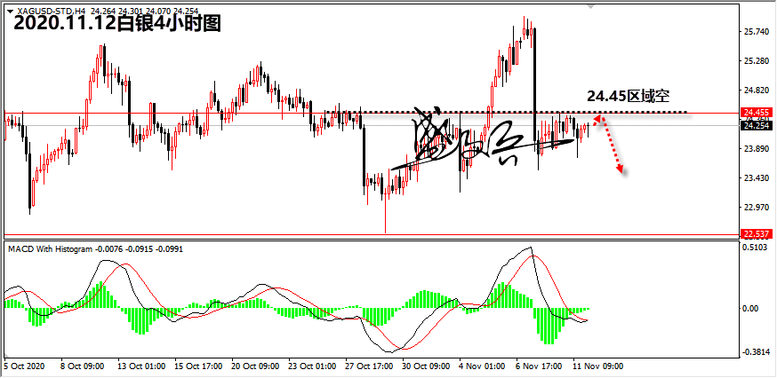 白银策略:24.45区域空,止损24.85,目标23.7,23.2
