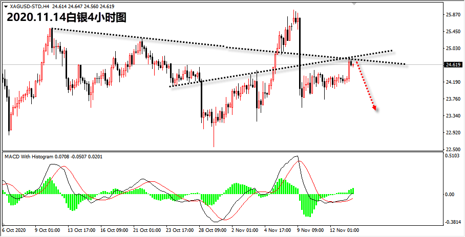 黄金单从技术面形态来看,周K线收一根实体大阴线,MACD在零轴上方死叉向下,预示价格有进一步向下的空间。从形态来看,在一根实体大阴线之后,连续的低位横盘震荡,形态上价格处于下跌旗形旗面的整理之中。形态上也是预示有进一步走空的空间。因此,下周主要思路还是逢高参与空头。