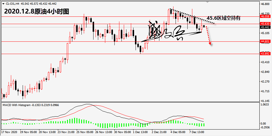 原油从技术面来看,日K线形成明显的阴包阳的反转形态,4小时图双顶形态基本形成,并且MACD指标在高位死叉背离向下,预示价格由及由进一步走低的空间。这也是笔者给出参与空头的主要思路。持有45.6区域空头者,继续持有,下方重点关注44.5和43.8区域的支持。