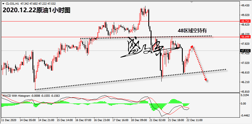原油完全符合比笔者的预期,今日价格再次在48.1一线承压后下跌。笔者在隔夜美盘和今日早盘明确给出在48.1一线参与空头,只要在48区域参与空头者已经完全获利。