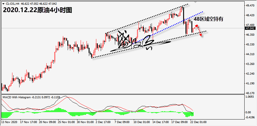 原油完全符合笔者的预期,价格在48区域最终还是承压回落。完全符合笔者的预期。笔者在隔夜美盘给出48区域空的策略,今日早盘再次提示48区域参与空头,只有在48区域参与空头者,目前完全处于获利中。