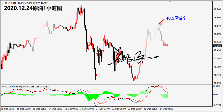 原油完全符合笔者的预期,今日笔者明确给出在48.6区域参与空头,最高触及48.58,完全达到笔者参与空头的区域,只要根据笔者空头参与者,均处于获利中。