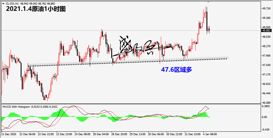 原油整体上符合笔者的预期,上周笔者明确47.6区域参与多头,只要根据笔者策略在低位参与多者,成功获利200点;