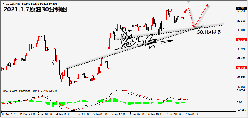 原油策略:50.1区域多,止损49.5,目标51.00,51.5