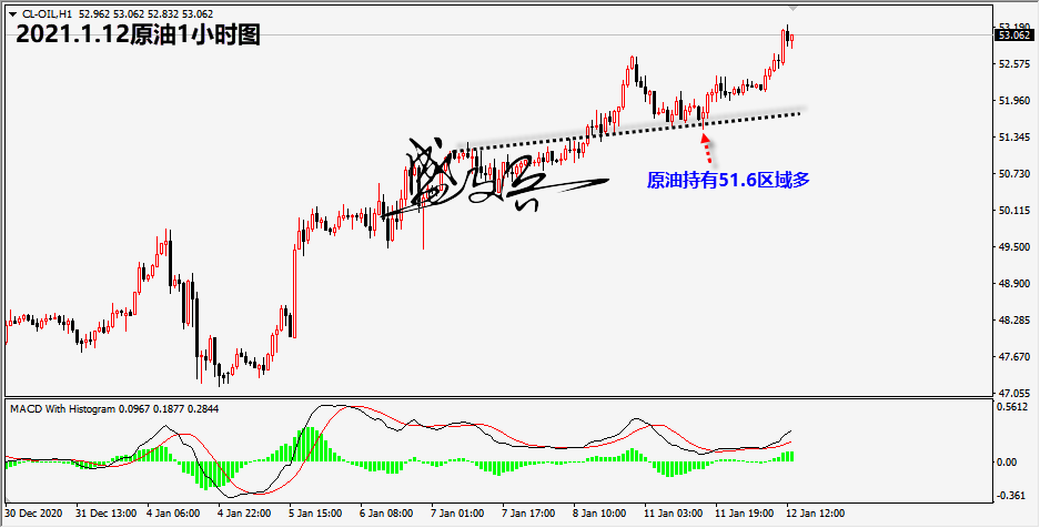 原油完全符合笔者的预期,周一笔者明确给出在51.6区域参与多头,价格回撤在51.5位置刚好获得支持后震荡向上,目前价格已经成功站上53上方。只要根据笔者策略参与多头者全部获利。