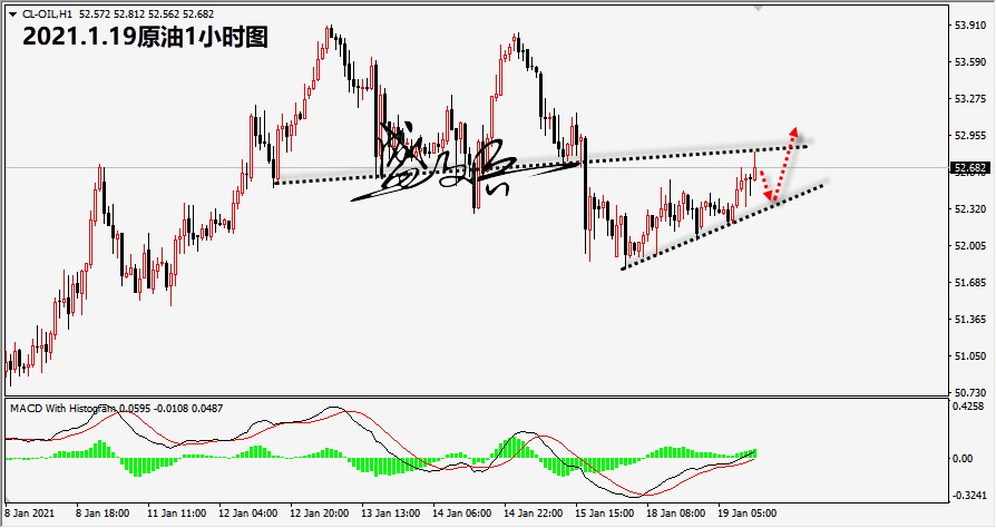 原油从形态来看,价格在上方52.8一线受到颈线位的压制,但是前期下方有支持。从位置来看,目前为止目前并没有合适的参与机会,上方有阻力,下方有支持。晚盘需要重点关注美股走势对于原油的影响,持有低位多头者可以继续持有。