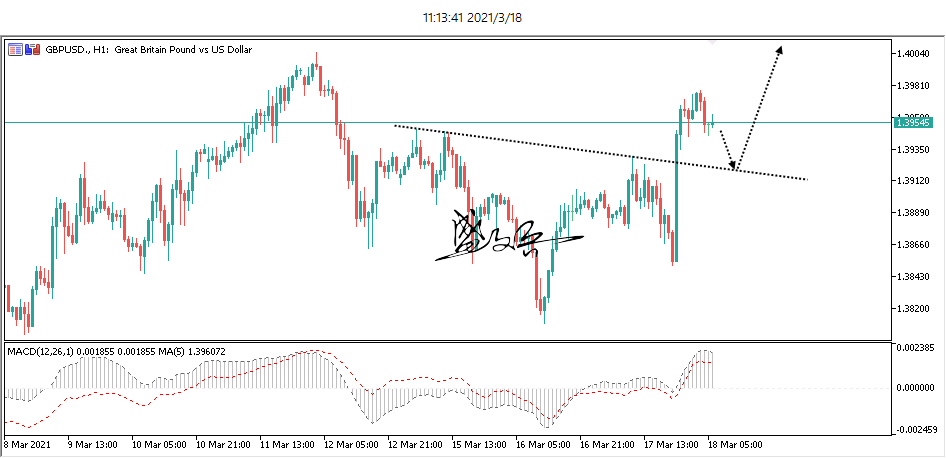进场点:1.392附近,止损点:1.383,止盈点:1.403~1.415