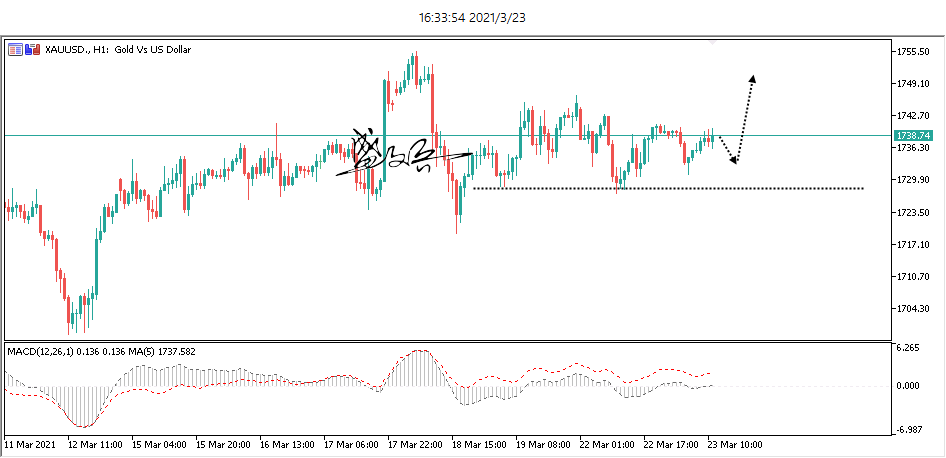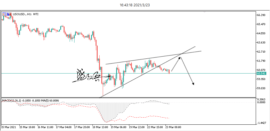 原油,亚盘的走势没有太多变化,从H1级别来分析,MACD慢线指标处于0轴下方,快线指标在0轴附近盘旋震荡,整体的价格走势依然是上涨乏力的形态。目前的主趋势依然是空头走势。亚盘的分析策略不变,还是考虑逢高做空,等待价格反弹到上方趋势线的共振压力区间看信号布局空单,目标看下方的支撑位置。请各位投资者不要盲目追空,及时关注策略的更新和提示即可。