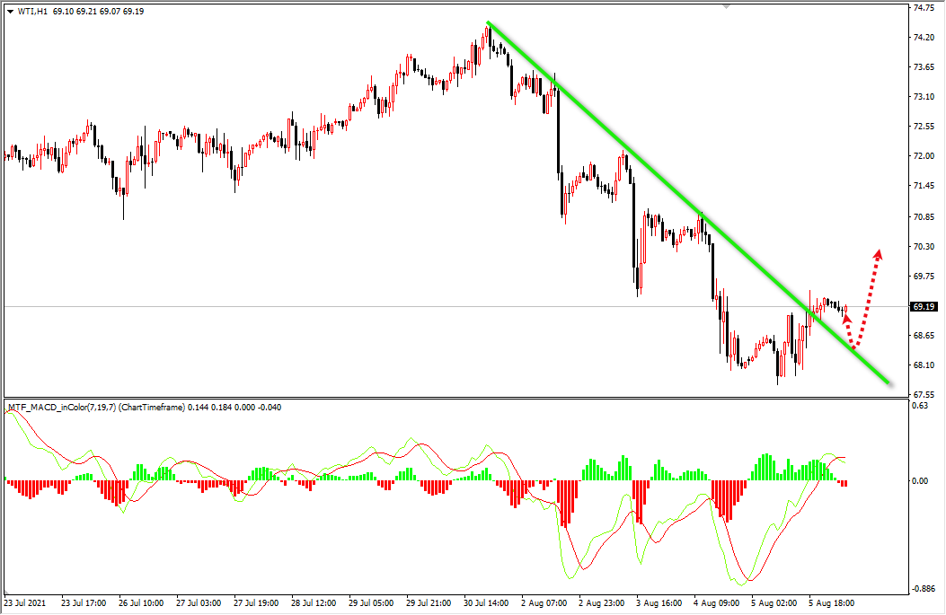 原油突破一小时下跌趋势线,所以今天先看反弹,下方关注支撑位68.20区域多。