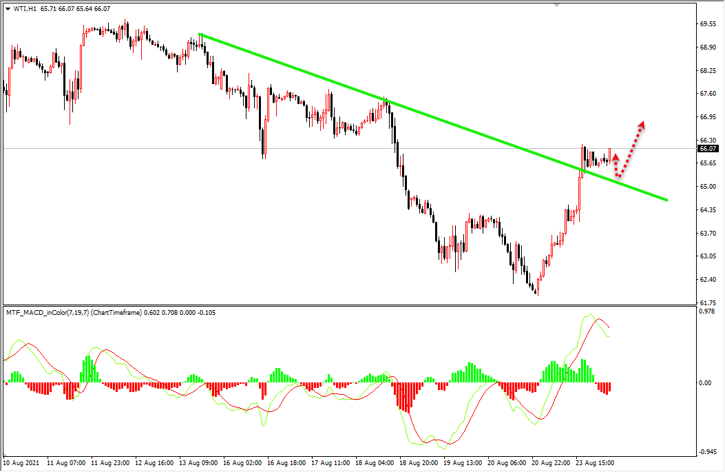 原油正如昨天预期的一样上涨,现在原油突破4小时下跌趋势线,今天原油回踩趋势线支撑位继续做多。