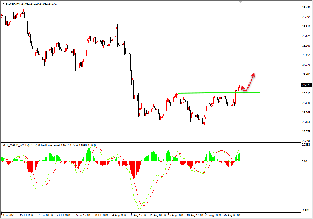 白银上周突破4小时阻力位,今天关注下方4小时阻力位尝试做多。