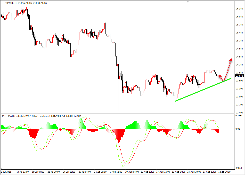白银上方即将接近日线趋势线压力位,下方关注4小时趋势线支撑位。