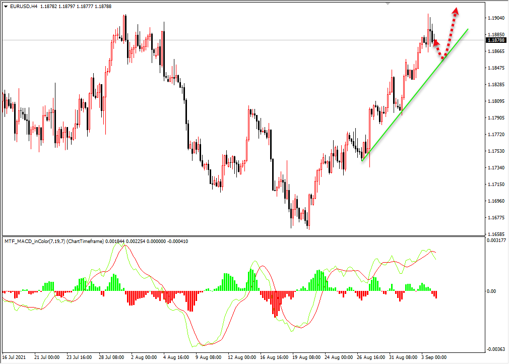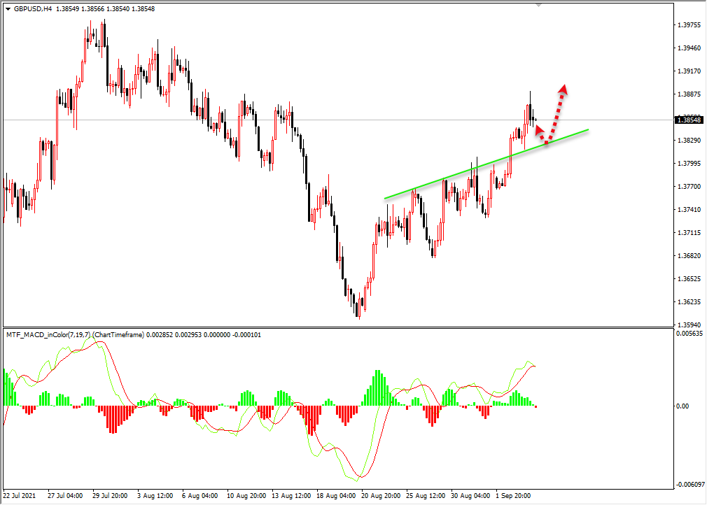 欧元一路强势上涨,现在有回调需求,今天关注4小时去实现支撑位,一定要耐心等待回踩趋势线支撑位后做多。