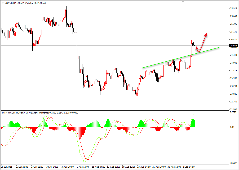 白银上周五强势突破,今天日内关注下方4小时支撑位继续多。