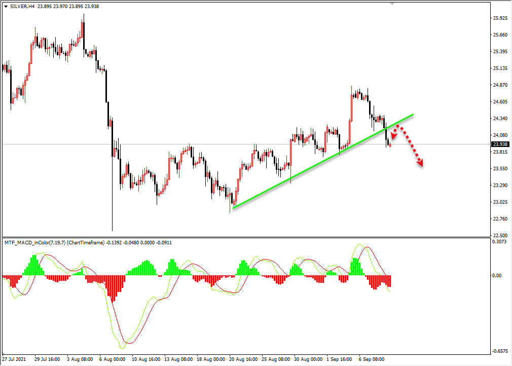白银4小时上升趋势线已经跌破,今日关注白银能否反弹4小时趋势线压力位做空。