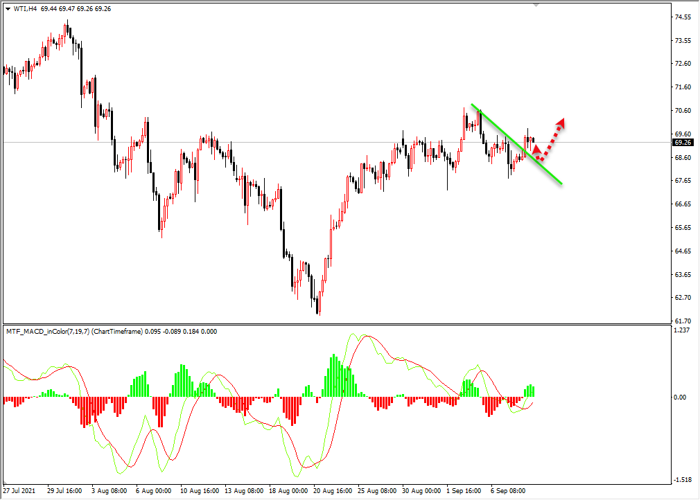 原油昨日强势突破4小时下跌趋势线,今日先考虑底多为主,上方关注日线压力位。