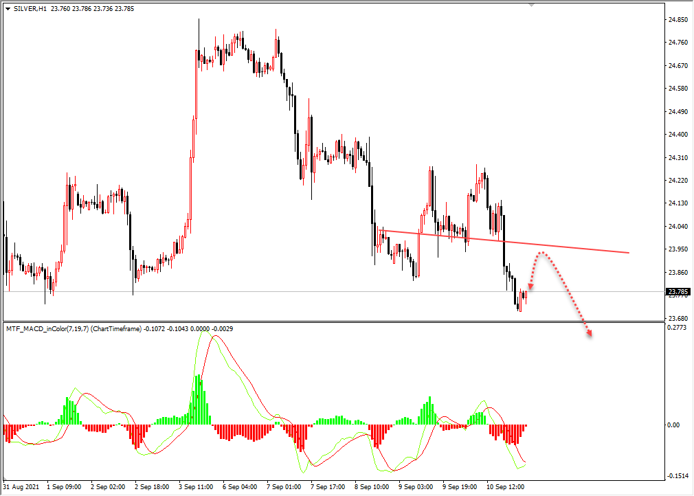 白银短线逐步走弱,所以日内先考虑回踩1小时压力位压力位做空白银。