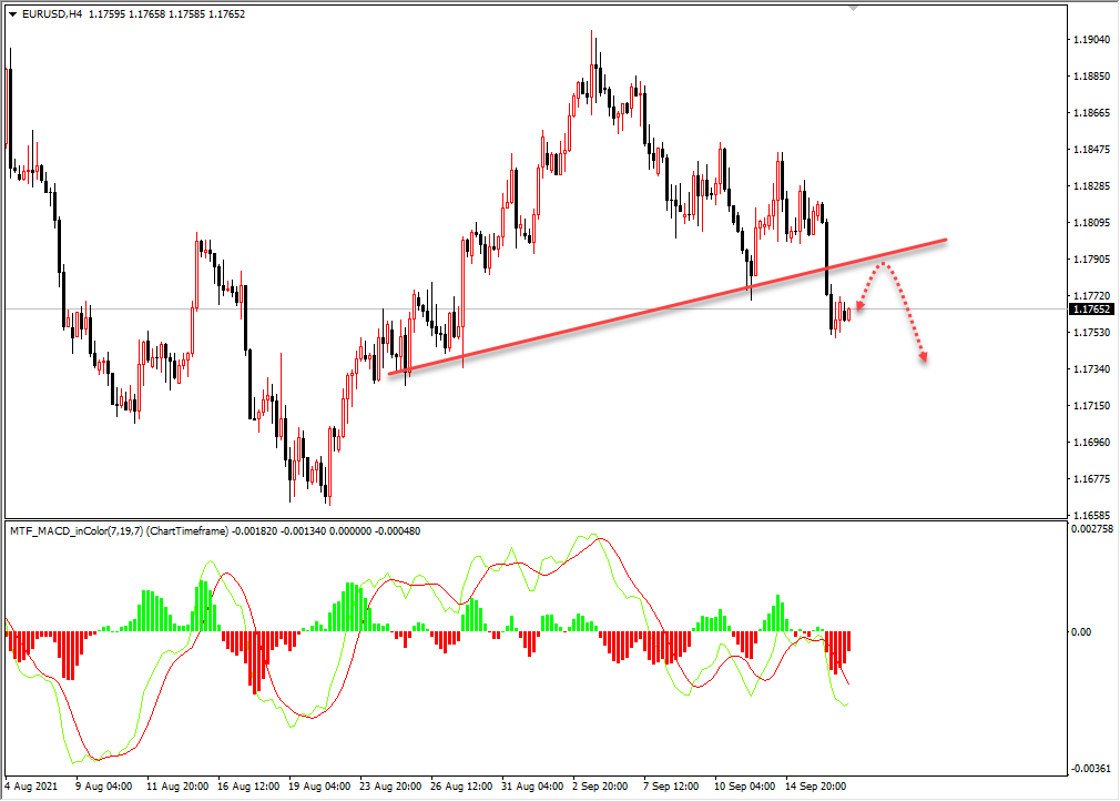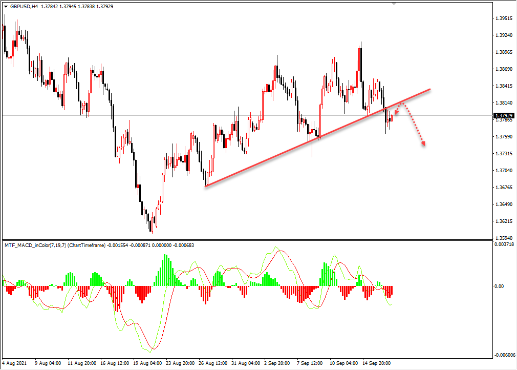 英镑昨日跌破4小时上升趋势线,上升趋势线转换为压力位,今日重点关注。