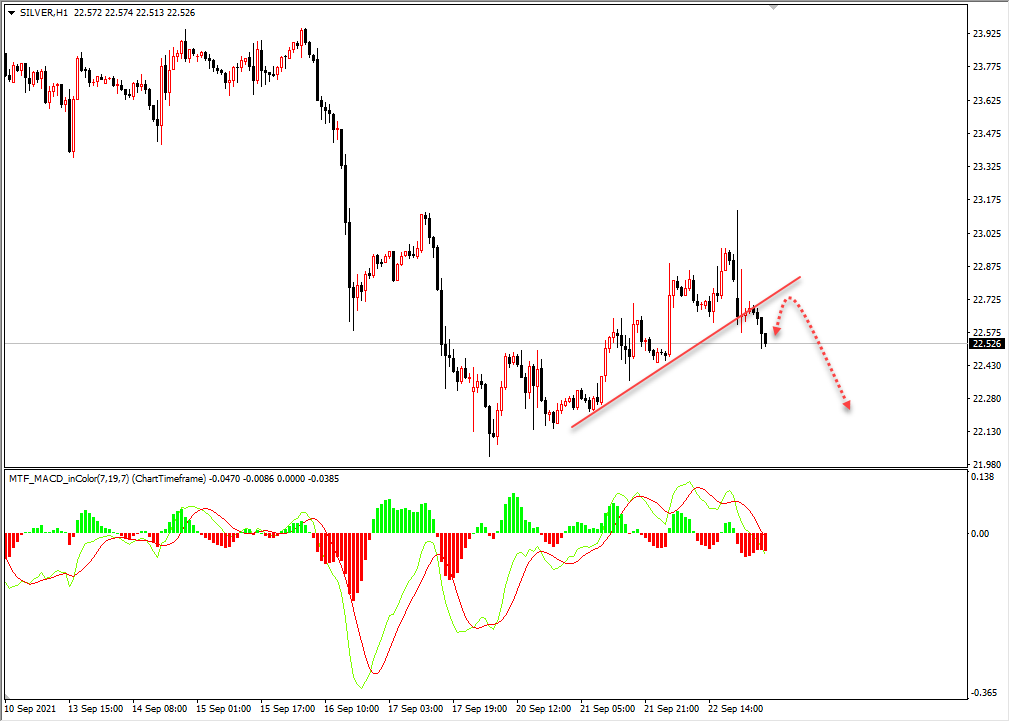 白银收到凌晨美联储利率决议以及鲍威尔讲话影响,向下突破1小时趋势线,今天日内关注1小时压力位做空。