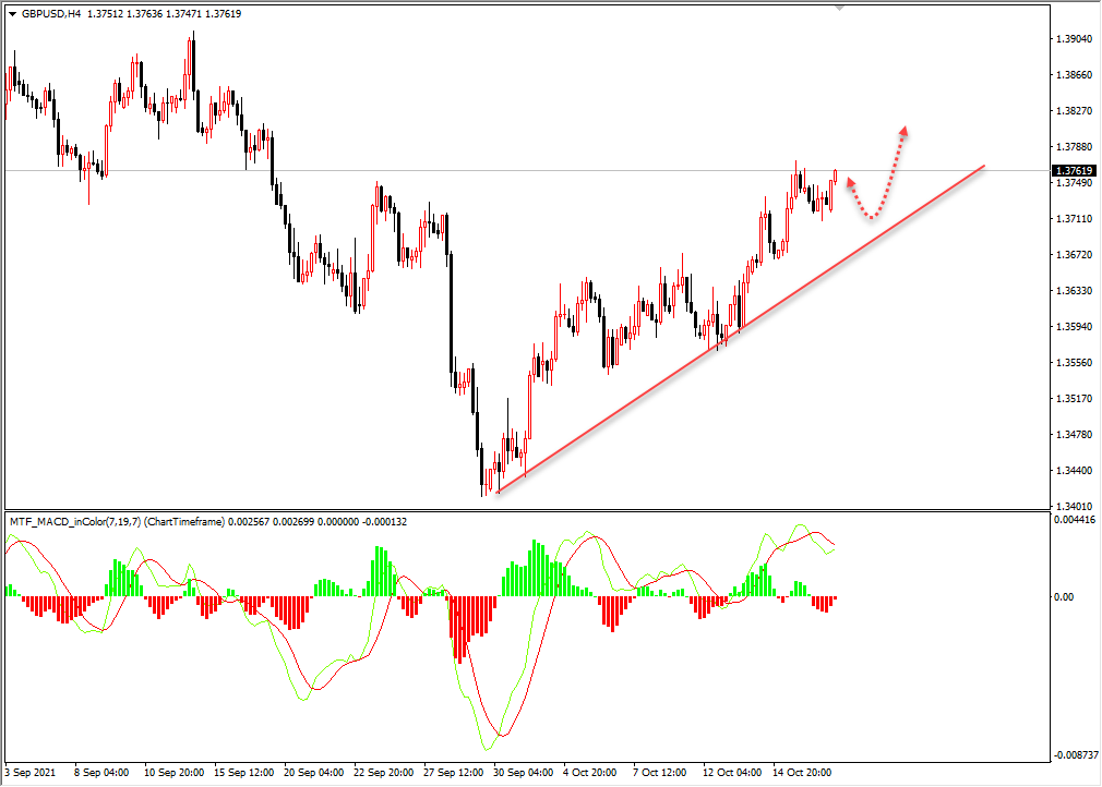 欧元从日线图,前期我们一直提示多头。今天耐心等待回踩一小时支撑位继续做多。