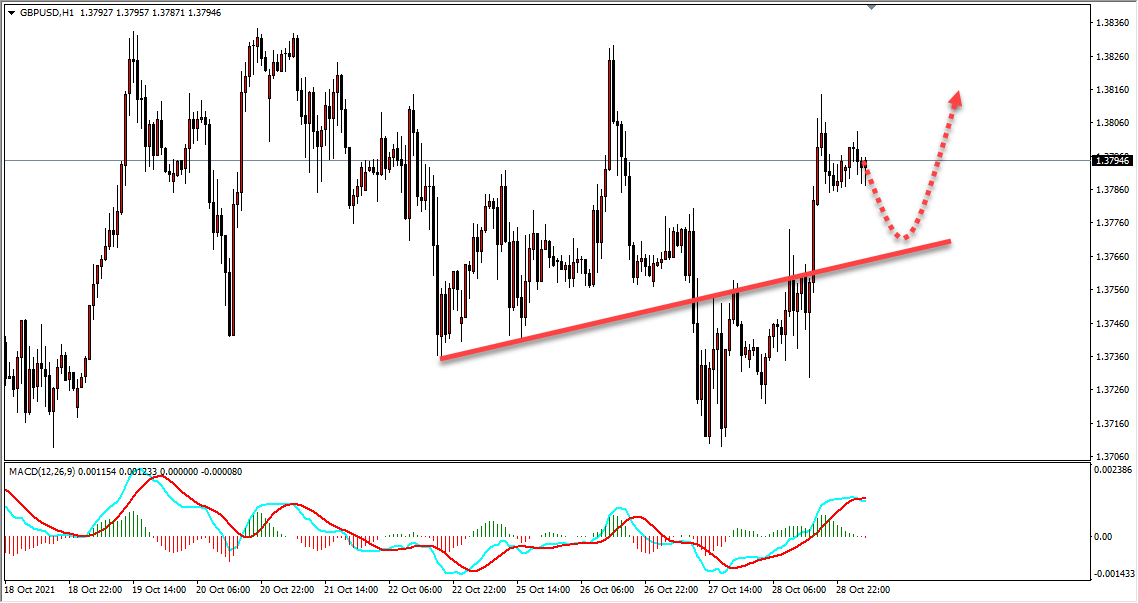 英镑昨日晚间展开拉升,今日关注能否回踩一小时支撑位,如果回踩给到机会可以继续做多。
