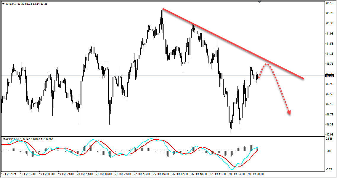 原油周线今天收周线投资者需要格外注意,如果周线收大阴线,下周原油将会持续下探。日内原油1小时下跌趋势线突破,但是仍然承压于4小时压力位,所以日内小关注上方压力位考虑做空。