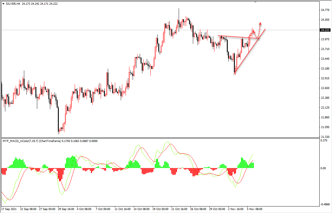 白银突破日线下跌趋势线后,日线转为上升趋势。日内关注下方支撑位继续考虑做多。