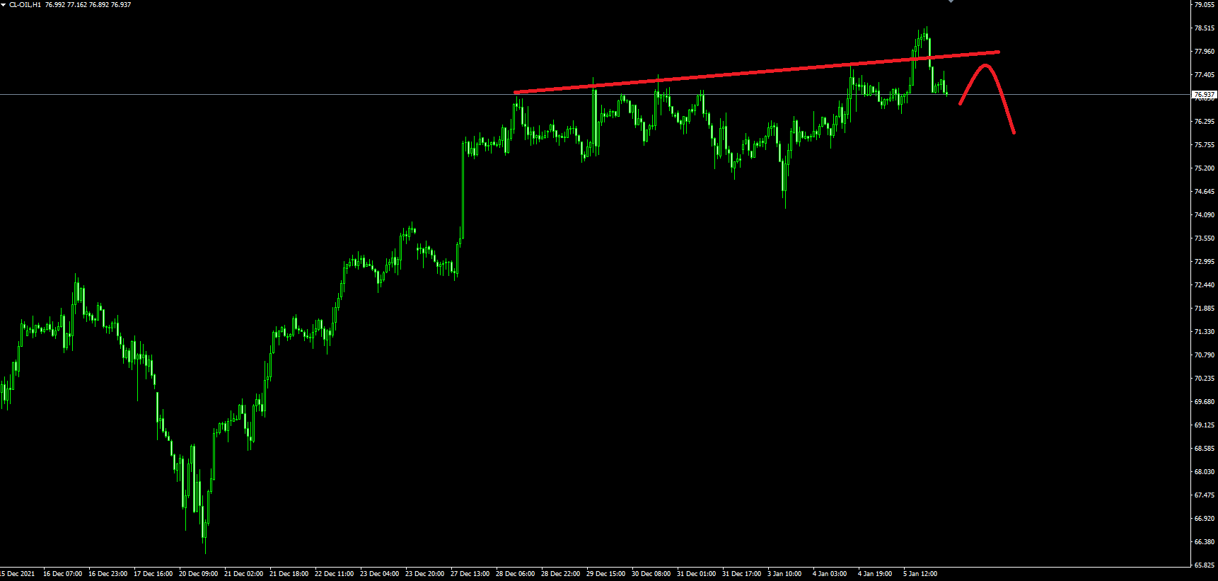 油价周三延续涨势,最高触及78.58美元/桶,投资者对OPEC及其盟友能否成功实现期望的增产仍抱有期望,美联储可能比预期的更早加息;但汽油库存猛增以及疫情的担忧,限制了油价涨幅。昨日公布的原油EIA数据虽然库存仍在持续减少,但是减小幅度大幅缩小,所以原油冲高后回落。总体上来看,市场对于OPEC+能否实现增产仍然抱有希望,基本面上短期关注地缘政治以及伊核谈判。从技术面来看短期上升趋势线有破位可能。1小时形态有走头肩顶的可能性,所以日内关注上方78.00区域压力位尝试高空。