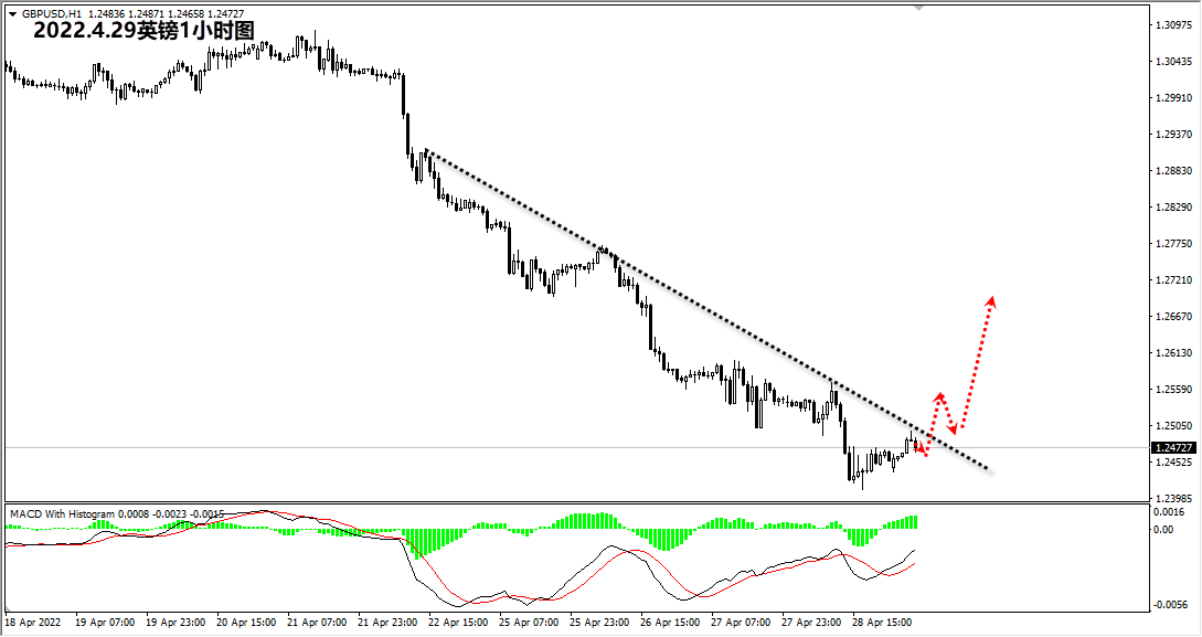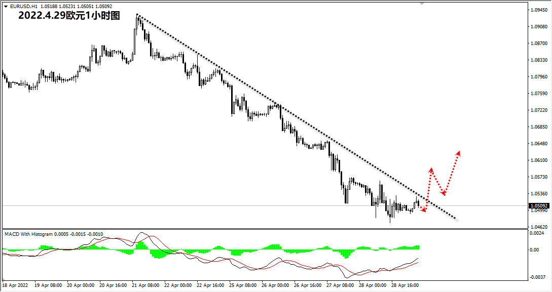 欧元本周已经大跌2.6%,价格一度跌破1.0500位置至1.0469;从走势来看,目前欧元无疑是极弱之中,但是连续性的大跌后,下跌空间已经非常有效,技术面需要技术性的修正。从技术面来看,价格延续趋势线不断的下跌,等等价格向上突破趋势线后再次对趋势线回撤后参与多头。