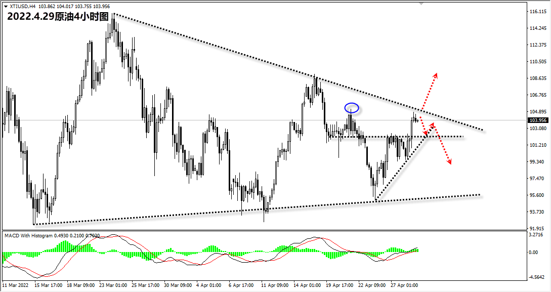 原油目前还是在三角区间震荡中。目前处于三角区间的上边沿区域附近。如果价格在上边沿区域再度承压,那么将再次回落,反之,强势向上突破,至少要看到三角区间的顶部。今日是4月分最后一个交易日,月图和周图K线将收定。5月份原油向那个方向走,月K线起到重要的指引。今日重点关注欧盘对于三角区间上边得势。无论向那个方向运行,等欧盘出现明显的信号后再去参与。