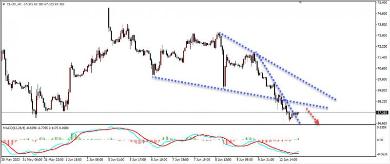 原油从目前技术面走势看,1小时短期下跌趋势线已经突破,但是上方关健的压力位以及长期下跌趋势线并没有突破。今天关注上方关健压力位区域看能否继续下行。