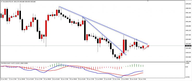 黄金昨日从技术慢看依托短期周一早间跳空的形成的支撑位上行后,并没有有效突破4小时下跌趋势线形成的压力位。现在4小三室这样持续横盘,今日突破4小时下跌趋势线的概率会增加。今日关注黄金能否突破4小时下跌趋势线形成的压力位。