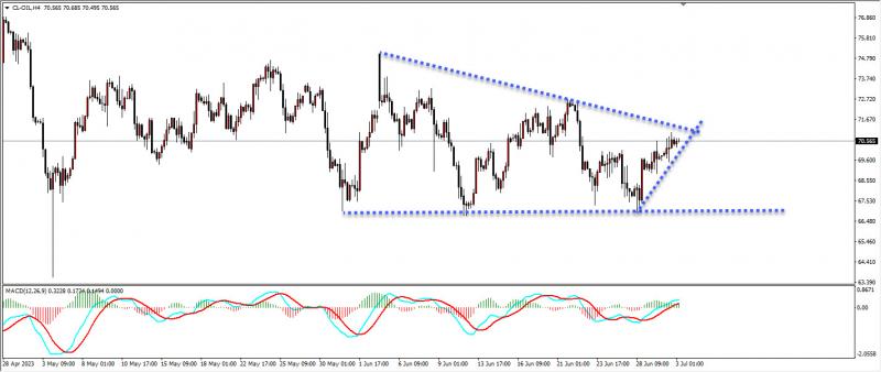 原油目前4小时走收缩三角形,现在接近三角形区间的上边缘,日内关注短线趋势线支撑位能否冲高,突破三角形区间上边缘压力位。