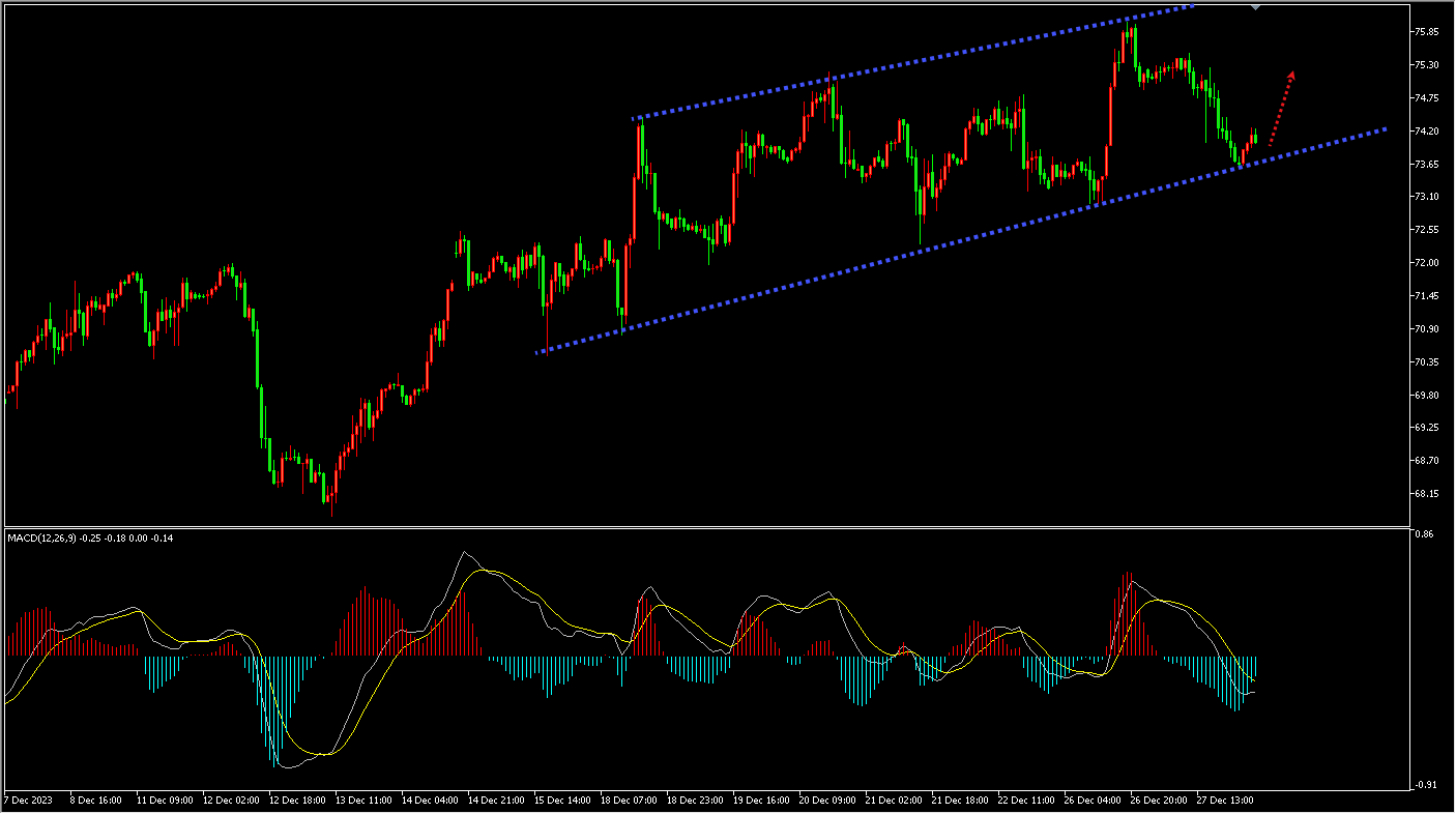 原油市场在周三(12月27日)出现了一定的波动。投资者对美国可能降息的乐观情绪刺激了经济增长和燃料需求的预期,但同时担心红海事态的发展对航运中断的影响。因此,油价在周三出现了近2%的下跌,消化了前一天的涨幅。但是目前原油上升趋势线依然良好,所以今日短线关注1小时上升趋势线的支撑位,出现企稳信号后做多原油。