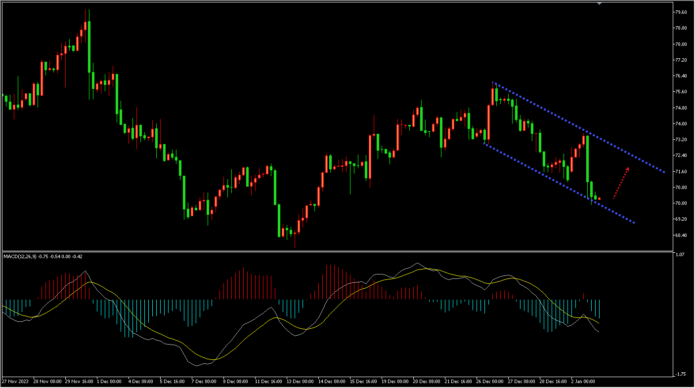周二(1月2日),美元走强,令石油承压。同时,由于对红海紧张局势可能扰乱供应的担忧有所缓解,油价在 2024 年第一交易日下跌,国际原油期货结算价跌超1%。今日原油先关注下方4小时支撑区域表现,反弹后在关注上方4小时下跌趋势线压力区域。