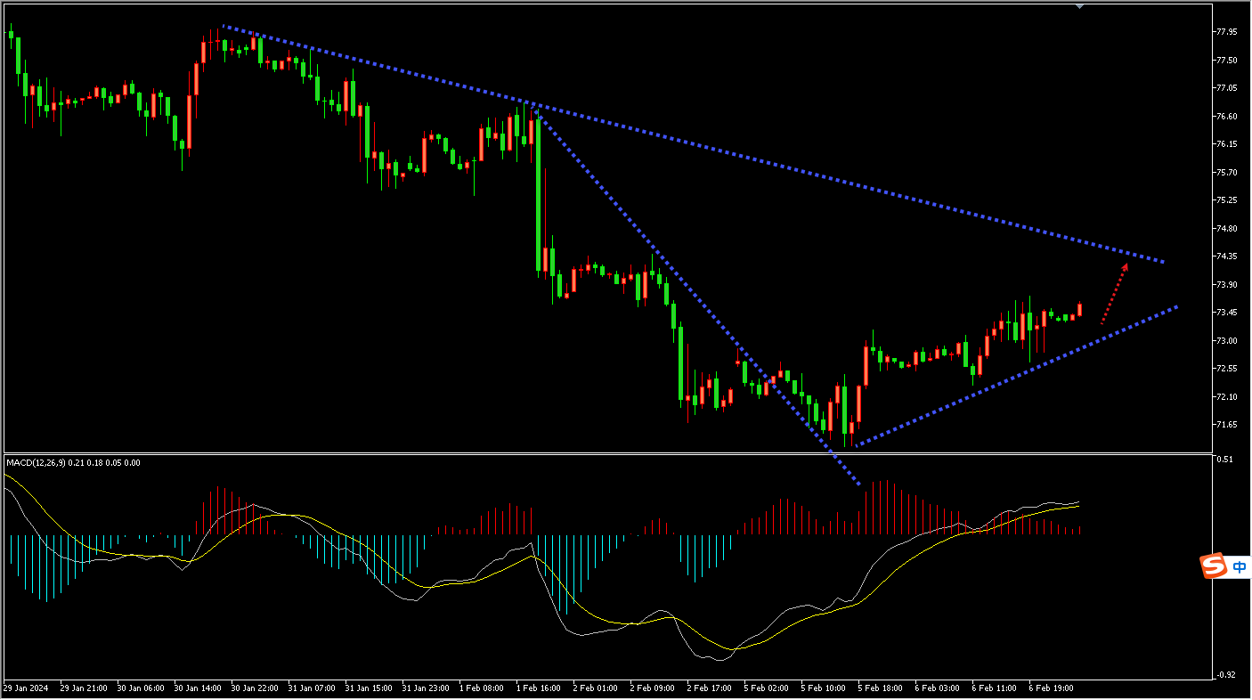 周二(2月6日),美原油价格在亚洲市场窄幅震荡,目前交投于72.68美元/桶。而周一,油价上涨约1美元,主要是因为市场担心中东地区的紧张局势和俄罗斯对乌克兰的战争持续可能抑制全球供应。布伦特原油期货和美国原油期货都出现了四个交易日以来的首次上涨,分别上涨了0.9%和0.7%。然而,K线图显示短期内仍存在进一步下行的风险。本交易日,市场将密切关注EIA原油市场月度报告和API原油库存数据,这些数据对油价的走势具有重要影响。原油今日继续关注1小时上升趋势线支撑区域表现,同时上方关注1小时下跌趋势线压力区域。