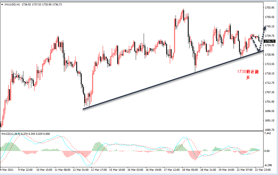 昨日鲍威尔表示复苏快于预期,经济增长势头将要增强,拜登总统将要推出3万亿美元的基建计划,旨在提振美国经济,并且声明美联储仍会提供支持,受这些消息面的影响,昨日美元的走势上冲无力,技术面走势依然还是维持震荡 目前黄金技术面短期的走势依然还是一个偏向小幅度的多头反弹上涨走势,目前技术面短期黄金维持在17
