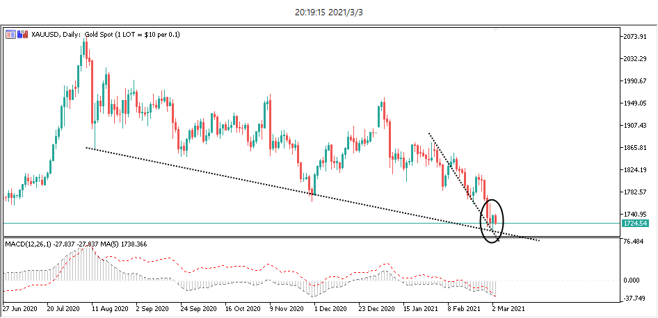 技术面分析 XAUUD~黄金~D1级别 XAUUD~黄金~H1级别 黄金,亚盘欧盘时段盘整回调,昨天D1级别在趋势线下方支撑位置收阳线,暗示多头走势占优势。目前H1级别ACD快线已经突破0轴上方,且H1走势已经突破了下行趋势线,预计美盘时段还将继续反弹上行。各位投资者朋友可以考虑在下方趋势线的支撑位置布局多单