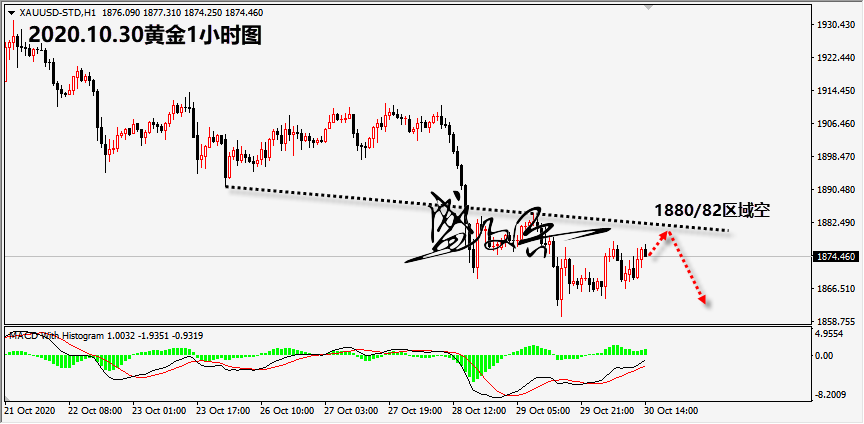 黄金 风险情绪继续在市场发酵,亚太股市全面的下跌,美股期指指数直接性走低,黄金的商品性再度承压。今日关注德国,欧元区三季度GD数据以及美国C物价指数。 黄金正如笔者的预期,亚盘价格反弹至1878.06位置承压后下跌,笔者今日明确给出在1878区域参与空头,只要参与空头者目前以及全部处理获利中。 黄金
