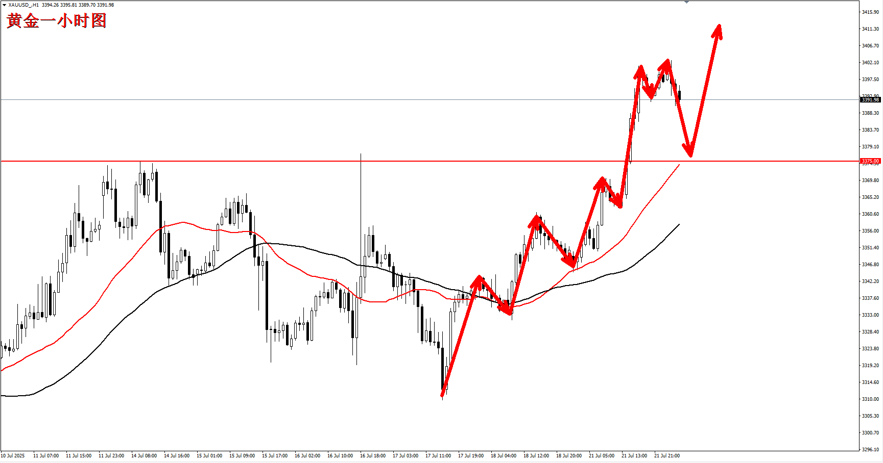 黄金昨天强势上涨,昨天的涨幅突破了最近一个月以来的新高,昨晚金价拉升之后并没有像之前那样冲高回落,反而是强势突破了多重阻力来到了3400关口,一小时的盘面来看,市场的方向是非常明确了,但还是不建议大家直接追多,等待回落再上车是最稳妥的策略! 早盘金价受阻3400附近,并且一小时盘面走出小双顶结构