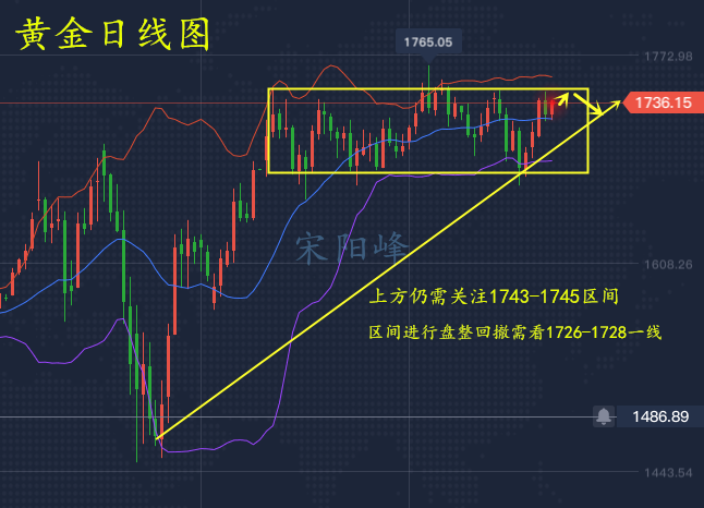 对于晚间的行情来说,如果要跌,午间也不会突破1733的压制,否则跌将被破坏,而之后行情小副拉升到到1737附近,对于接下来的行情来说,日线上方的1740还未到达,也就给不到我们做空的点位,那么只能继续关注1733-1735区间的突破情况,所以,这一区间仍是我们重点关注。