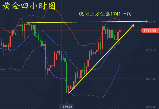从四小时来看,方向就给的很充足,多头很强势,给美盘构造一条完整的上升趋势线,若是晚间给到我们回撤做多的可能,直接可在1733-1730一线参与,若是行情继续攀升,等到企稳1743-1745一线才是我们参与做空的机会,所以,晚间还是重点关注1733-1735一线的争多,这是确定晚间方向的重要区间。