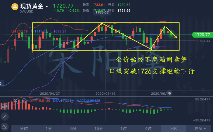 上周五收盘的一根标准的上影线收盘,这个空头趋势对于午后的行情而言,完全判断的没问题。再次验证天的行情走势即将迎来空头的趋势,日线的箱间还未走出,1726的支撑已经突破,短暂并未有突破大箱间的趋势,空头的力量发展,而午后的方向还是以看空为主!