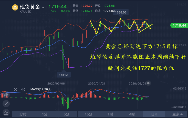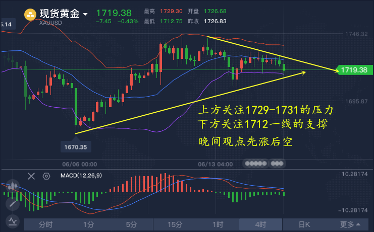 四小时来看,布林带有开口的迹象,给到的是空头力量的发酵,所以,我们要等到目前这根四小时线收线才有接下来的晚间方向的确定。所以,还是依据下方1713的阻力看涨,上涨短暂的1727看空,目前既然主力趋势不明显,目前就采取区间做单的方法获取利润!