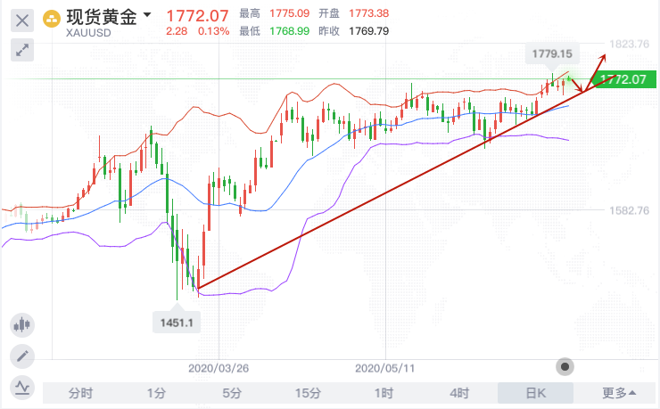 从长期方面讲,黄金自然继续攀升,但是周五黄金暴涨23点后,两个点的回撤空间,显然是不满足行情发展的需求,所以,预计今天早间的短期回撤的空间是给到了,自1775附近开启了第一波回撤,但是从日线来看,上周五的行情收盘收线成一根长长的下影线,布林带上轨开口增大,说明后市上涨的空间依旧很大,破位1800完全是7月份能够给到的行情,至于今日行情,短暂看一波回撤,做多头趋势,短暂的回撤空间是多头爆发点,所以,本周1780-1800将会是本周行情的突破区间!