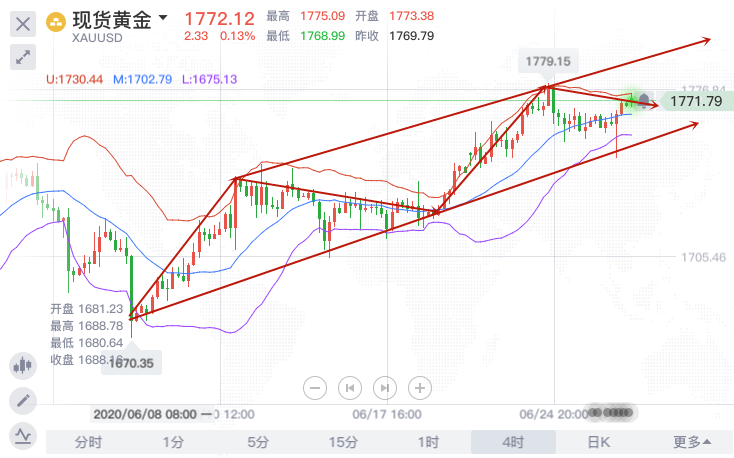 (6月29日)周一早间,金价开盘1773附近,如我们上周日所预测的那样,直接上涨至1775附近,之后就开启下跌的攻势,直接下滑至1769附近,前后6点利润跟上了吗?现在行情仍在1768附近徘徊。