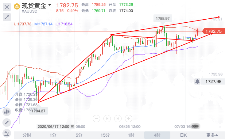 周一(7月6日)欧市盘中,现货黄金保持坚挺,目前交投在1775美元附近,走势等待进一步刺激。上周五,黄金价格连续第二天保持在1775.00美元的水平附近,由于周五美国假期的影响,黄金交易量和波动范围有所降低。黄金价格几乎正好处于每盎司1750-1790.00美元四周区间的中值水平。今日美国股市的回归将引发更大的波动,看涨的交易员短期内可能会感到失望。如果今天席卷亚洲的“病毒峰值”这一积极情绪延续到美国股市交易时段(我认为可能不会),那么在这些水平上,黄金在当前水平将出现一些抛售压力。