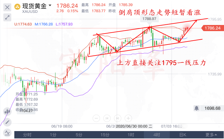 四小时方面,倒山顶的形态逐渐完善,上方1793-1795一线的压力岌岌可危所以,今天行情的主导力量还是以看多为主,从小时线来看,白盘上看1791,等待回落至1783附近,多头力量开始发散。上方的最高点显然不是我们白盘所能考虑的,那么今日早间,我们先关注行情回落至1783-1781额滴回撤力度,等待行情企稳之后,再看1791附近的突破。今天早间下方关注1781-1783一线的支撑,上方关注1791-1789一线的压力!