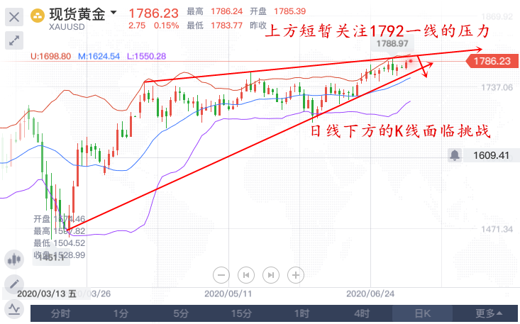 周一(7月6日),现货黄金走高,尽管中国股市暴涨,市场对中国经济强劲反弹的预期升温,促使投资者买入风险资产,不过考虑到全球、尤其是美国新冠疫情的不确定性,美元指数跌出一周半新低,限制了金价回落。由于周一出现一些新的美元抛盘,金价扭转早前下跌至1770美元的劣势。此外,再加上对冠状病毒病例持续激增的担忧,进一步为避险资产黄金提供了一些支撑。