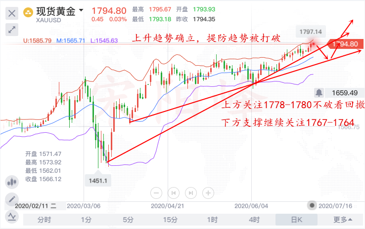 黄金方面,周二(7月7日),强劲的股市和美国服务业数据反弹削弱市场避险情绪,打压美元走势。金价始终徘徊近八年高位,一方面对经济复苏的怀疑仍支撑金价,另一方面全球央行宽松政策和美元贬值的预期也提振黄金长期乐观看涨。全球黄金ETF持有量大幅飙升,总增持量逼近2009年创下的纪录。而现货黄金方面也创历史新高1797附近,黄金大幅的上升是否直指1800?